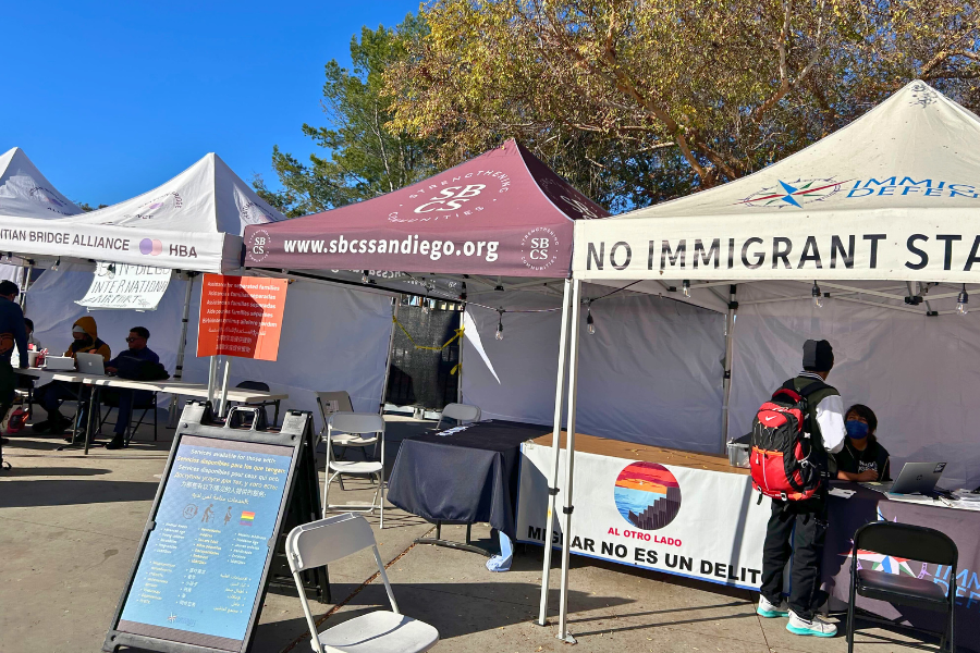 Nestled in City Heights, one of the most diverse neighborhoods in the region, San Diego’s sole migrant welcome center stood until recently. At the time of our tour, hundreds of migrants disembarked from a large bus, spreading out to receive hot meals, charge their phones, pick up warm coats, or get help making plane reservations. This welcome center existed to aid the hundreds of immigrants who were previously being released on the streets. A dozen nonprofits were on site to help with family reunification, traveling to meet sponsors across the country, and more. We heard conversations in numerous languages, with staff and volunteers aided by interpreters and Google Translate. Most migrants were excited, buoyed by the support they were receiving and the anticipation of finally reaching their sponsors.