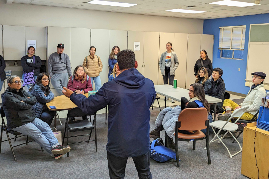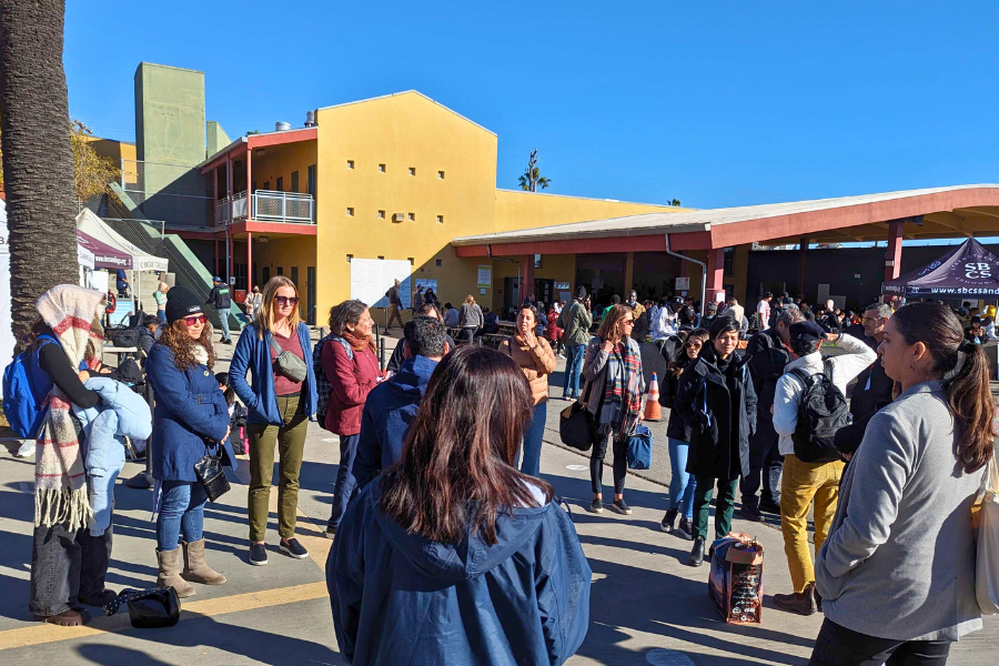 Nestled in City Heights, one of the most diverse neighborhoods in the region, San Diego’s sole migrant welcome center stood until recently. At the time of our tour, hundreds of migrants disembarked from a large bus, spreading out to receive hot meals, charge their phones, pick up warm coats, or get help making plane reservations. This welcome center existed to aid the hundreds of immigrants who were previously being released on the streets. A dozen nonprofits were on site to help with family reunification, traveling to meet sponsors across the country, and more. We heard conversations in numerous languages, with staff and volunteers aided by interpreters and Google Translate. Most migrants were excited, buoyed by the support they were receiving and the anticipation of finally reaching their sponsors.
